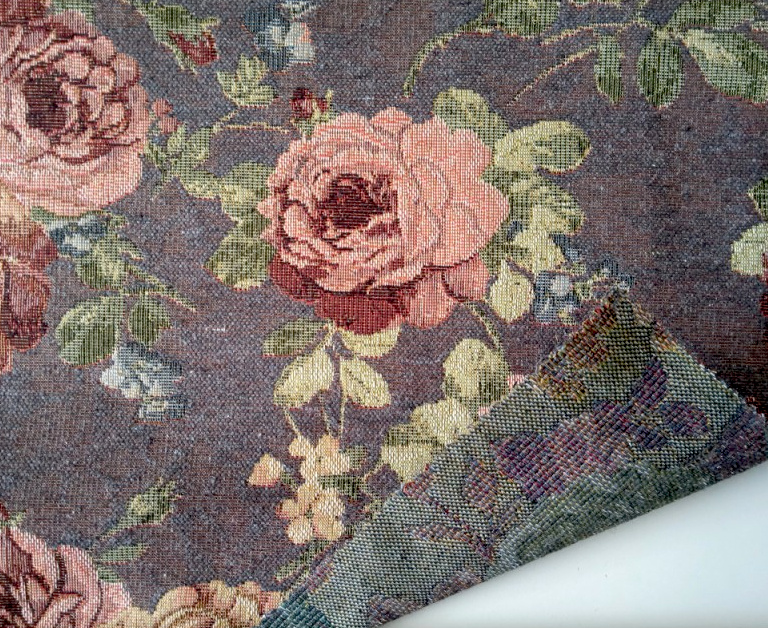 Tato dekorační/potahová gobelínová látka v šedohnědé barvě je zdobena bohatým květinovým vzorem s růžemi v různých odstínech růžové, červené a krémové barvy. Květiny jsou doplněny zelenými listy a drobnými modrými kvítky. Vzor je detailní a bohatý, což dodává látce elegantní a klasický vzhled. Tato látka je ideální pro dekorativní účely nebo jako potahový materiál pro nábytek, dodávající interiéru sofistikovanou a vkusnou atmosféru. Je vyrobena z kvalitních materiálů, což zajišťuje dlouhou životnost a odolnost vůči opotřebení. Perfektně se hodí pro výrobu polštářů, přehozů, závěsů a čalounění různých druhů nábytku, jako jsou křesla, pohovky nebo židle. Tato látka přináší do vašeho domova šarm a luxus.