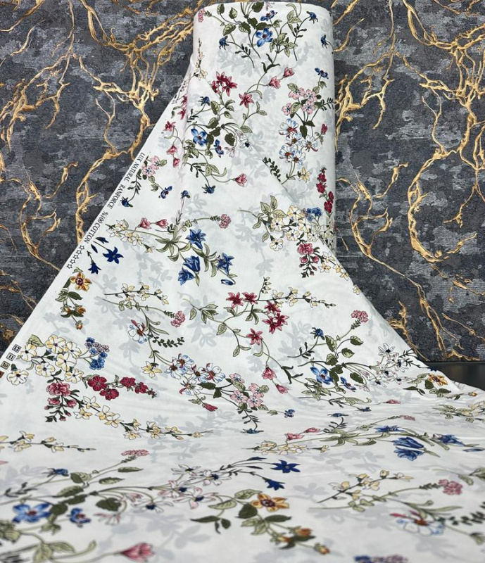 Jemný vzor malovaných lučních květin v červených, modrých a žlutých odstínech na bílém podkladu dodává látce romantický a svěží vzhled.
