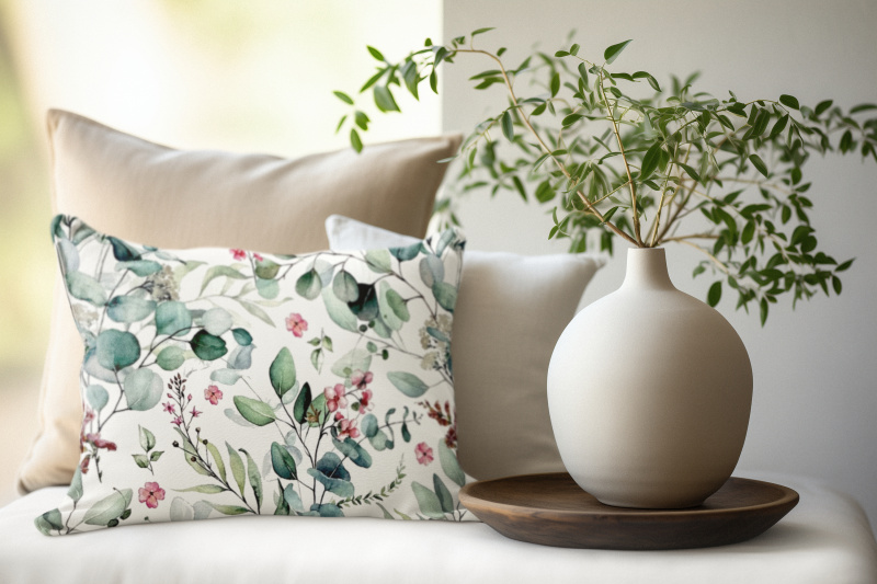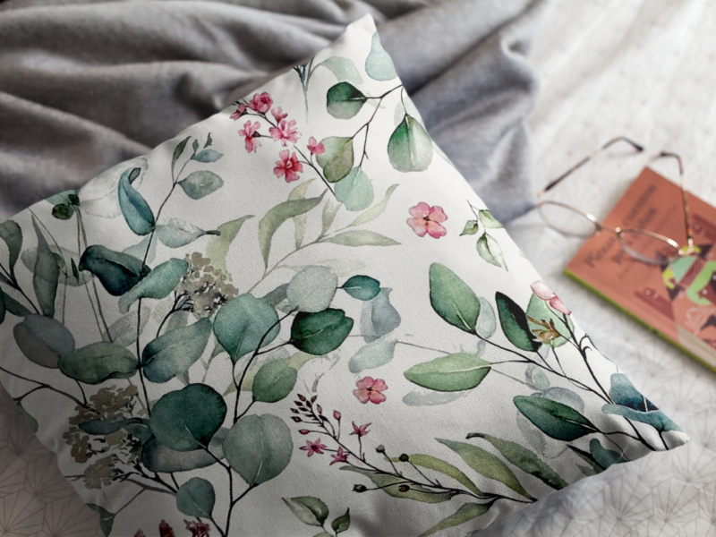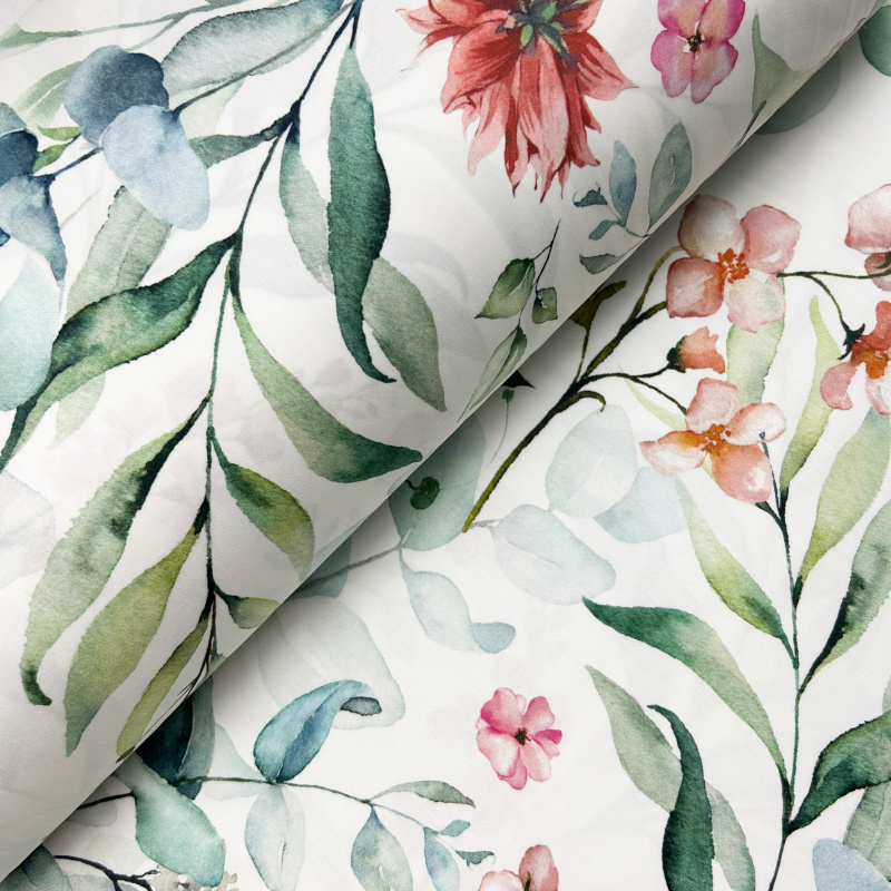 Povlak vyrobeno se satánové látky v jemném přírodním stylu s rostlinným vzorem. Základní barva je bílá a vzor se skládá z pestrobarevných květin a zelených listů, vytvořených ve stylu akvarelových ilustrací. Obsahuje prvky růžových květů, světle modrozelených listů eukalyptu a dalších přírodních motivů, které vytvářejí atmosféru klidu a harmonie.