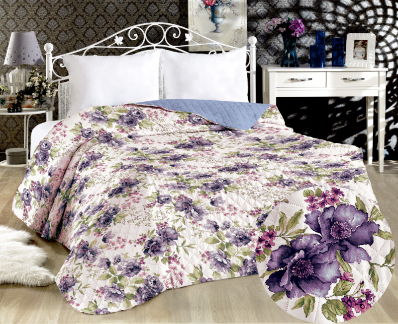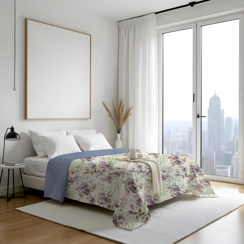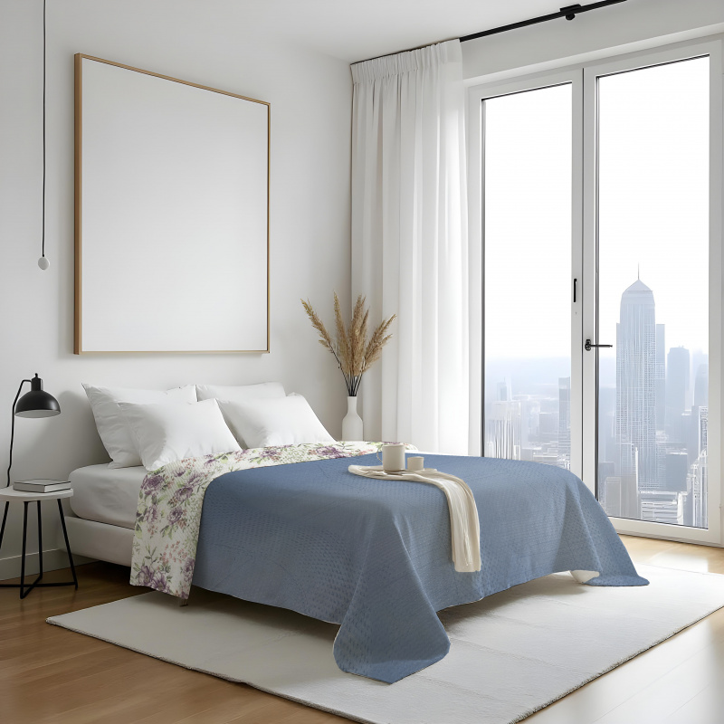 Oboustranný přehoz Colore – fialové květy / modrý přináší do ložnice harmonii fialových květin. Jedna strana je zdobena jemným motivem fialových květů, který působí něžně a živě. Druhá strana je jednolitě modrá, nabízí střídmý a uklidňující vzhled. Díky oboustrannému provedení lze styl ložnice snadno měnit — podle nálady zvolíte buď květinový motiv, nebo jednolitou modrou plochu. Přehoz zároveň chrání povrch postele a dodává prostoru útulný a osobitý charakter.