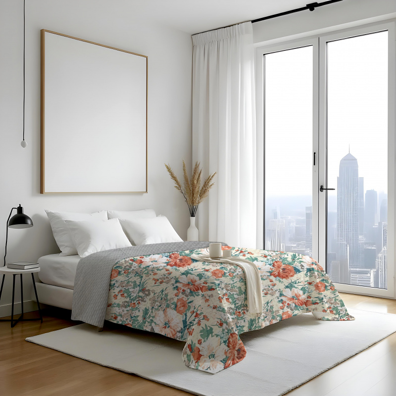 Oboustranný přehoz Colore – květy / šedý přináší jemný květinový motiv v elegantním provedení. Jedna strana je zdobená vzorem květů na světlém, neutrálním podkladu, který působí vzdušně a romanticky. Druhá strana je jednobarevná, v čistém šedém tónu, a dodává prostoru klidný, minimalistický vzhled. Díky oboustrannému provedení lze styl ložnice snadno měnit — podle nálady si vyberete dekorativní květinový motiv, nebo jednoduchou jednolitou šedou plochu. Přehoz navíc chrání povrch postele a přináší do interiéru útulnost i elegantní charakter.