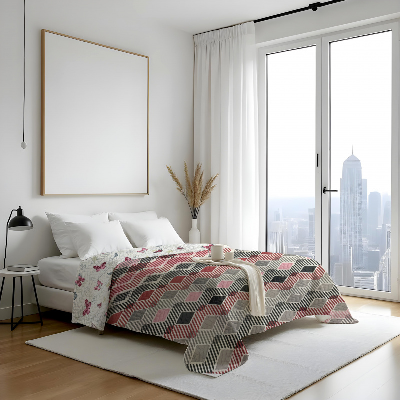 Oboustranný přehoz Colore – geometrická mozaika / motýlci kombinuje moderní a hravý design. Na jedné straně představuje dynamický vzor geometrické mozaiky, který působí energicky a stylově. Druhá strana zdobí jemný motiv motýlků, přinášející lehkost a romantiku. Díky oboustrannosti můžete snadno měnit styl ložnice podle nálady — od výrazného a moderního po něžný a dekorativní. Přehoz zároveň chrání povrch postele a dodává místnosti osobitý charakter, který kombinuje strukturu a vzdušnost.