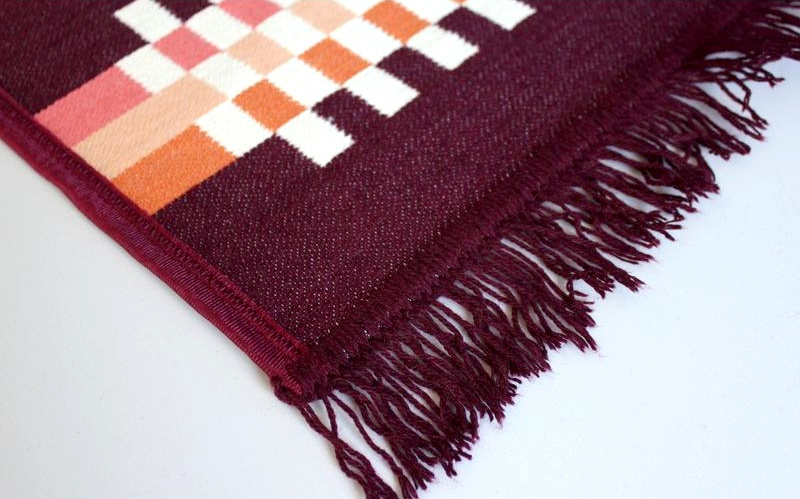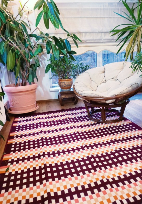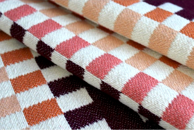 Tkaný koberec ''bez vlasů'' s moderním kostkovým vzorem.