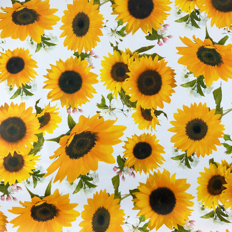 Omyvatelný PVC ubrus v šířce 140cm se vzorem slunečnic. Z rubové strany je ubrus opatřen textilní vrstvou, která jej zpevňuje a zároveň zabraňuje klouzání ubrusu po stole.