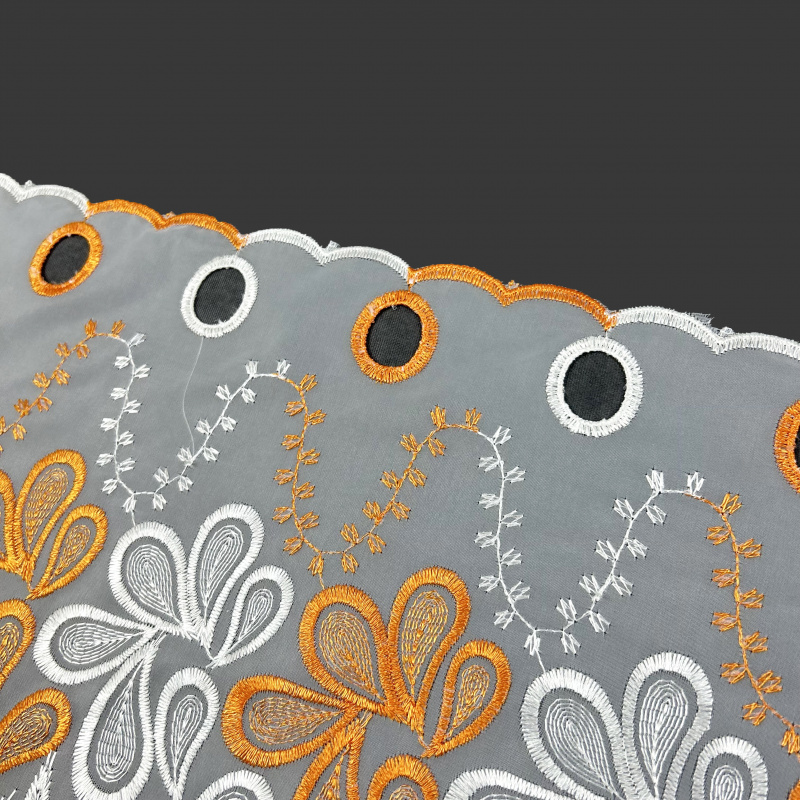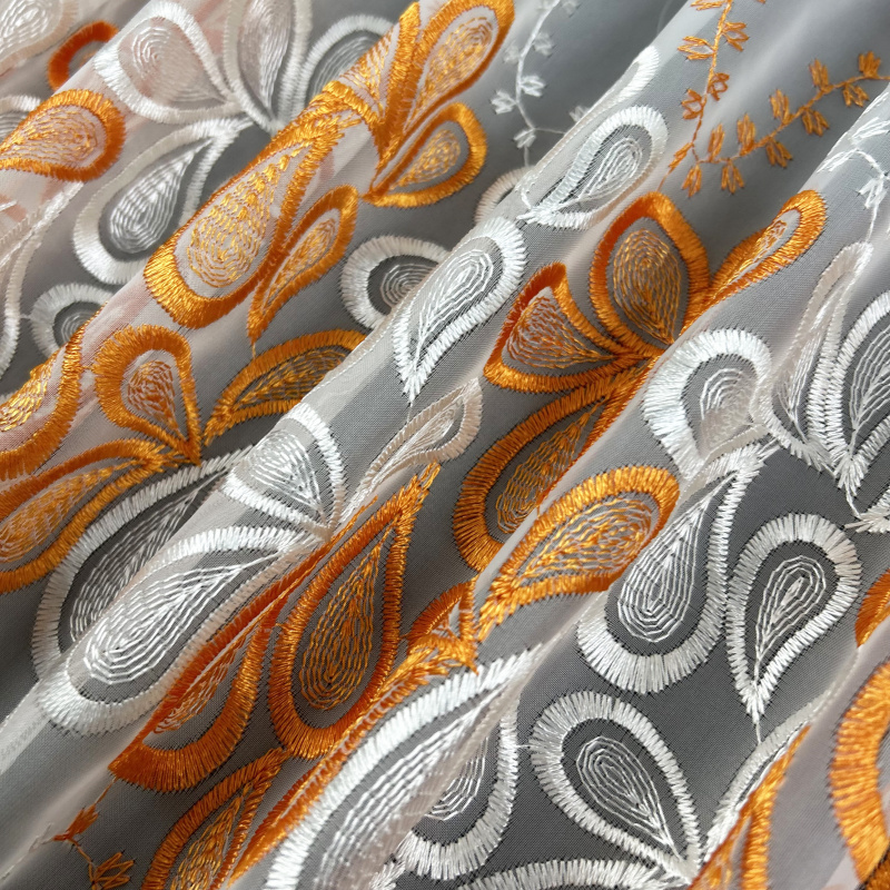 Voálová záclona s výšivkou v oranžové a smetanové barvě.