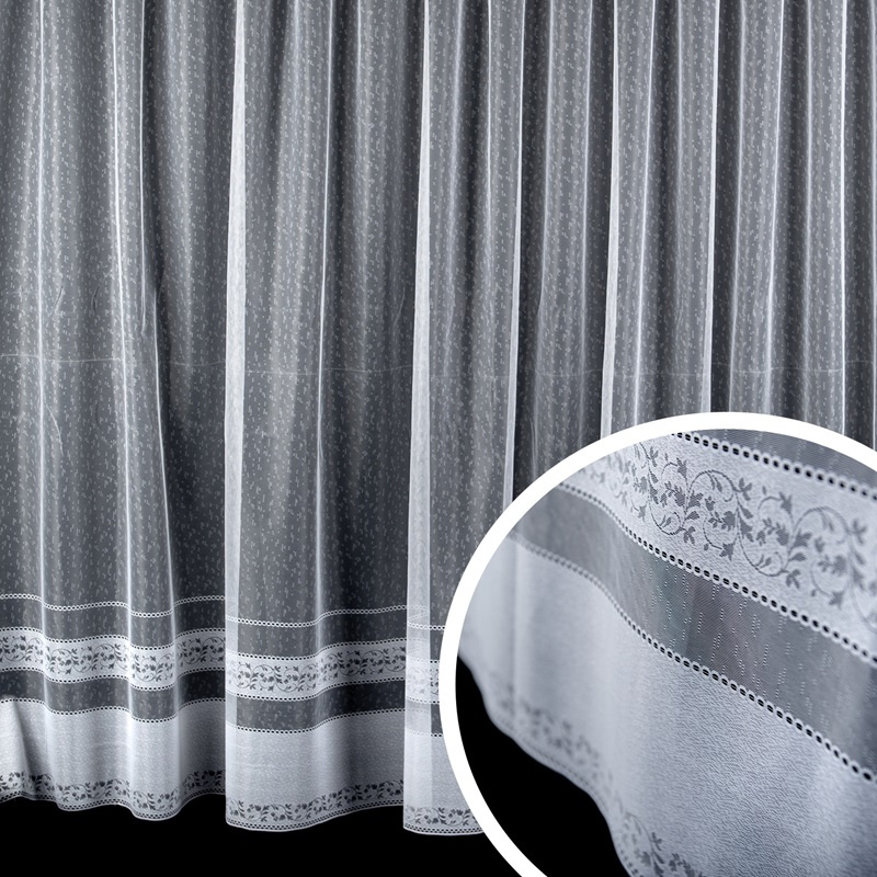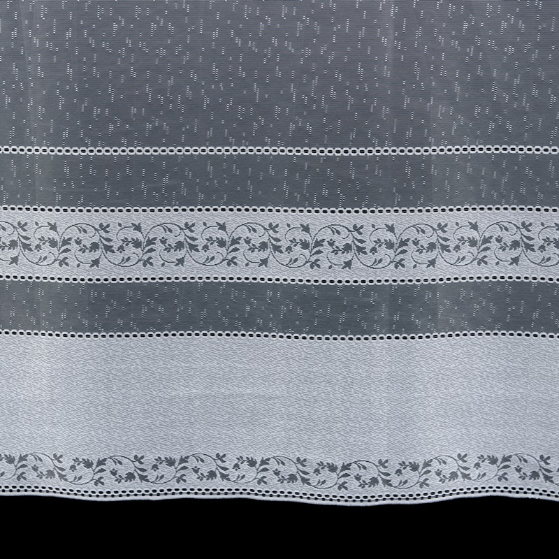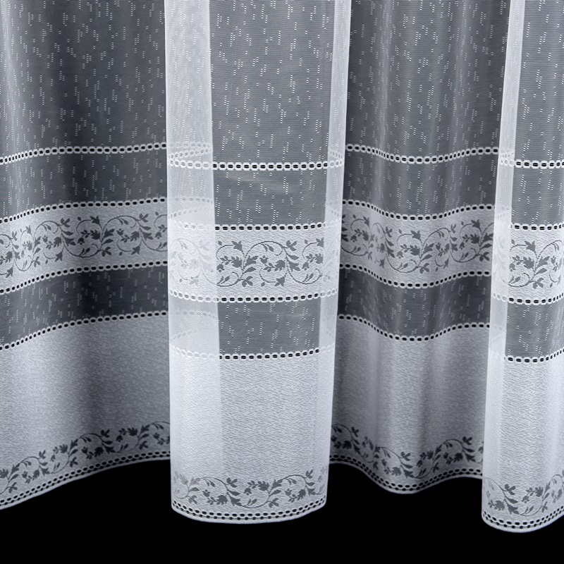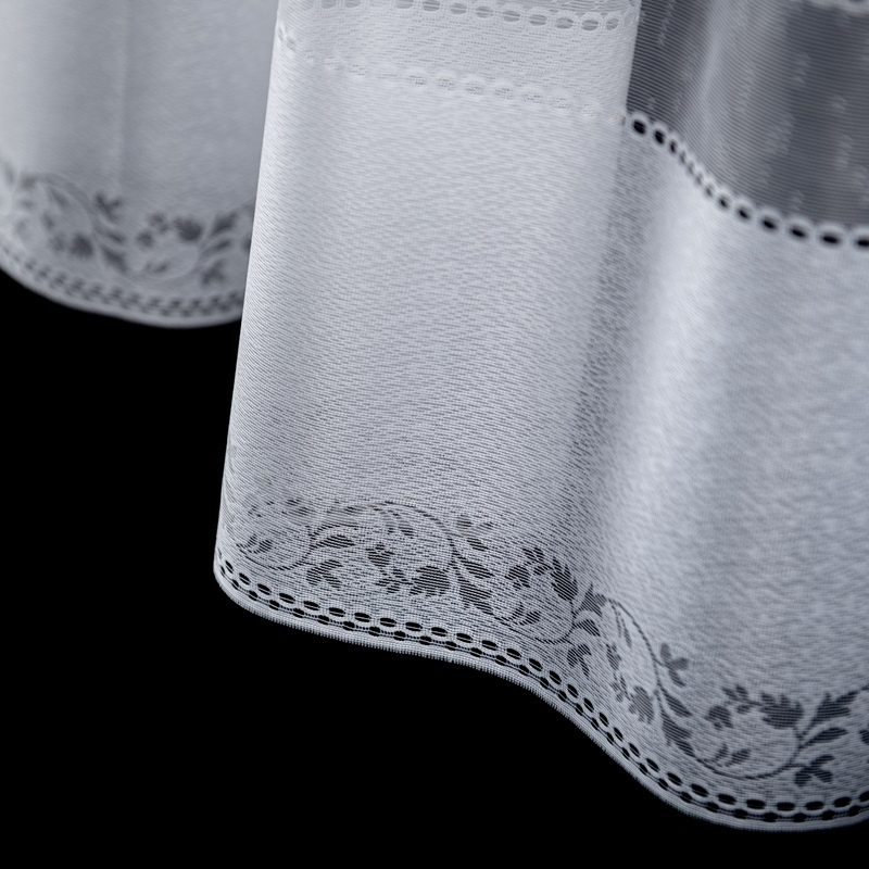 Žakárová záclona bílá 1491, metráž, je vyrobena z jemného žakárového materiálu v bílé barvě. Spodní okraj zdobí elegantní květinový vzor doplněný jemnými geometrickými detaily. Díky průhlednému designu záclona propouští dostatek přirozeného světla, zároveň však poskytuje určitou úroveň soukromí.